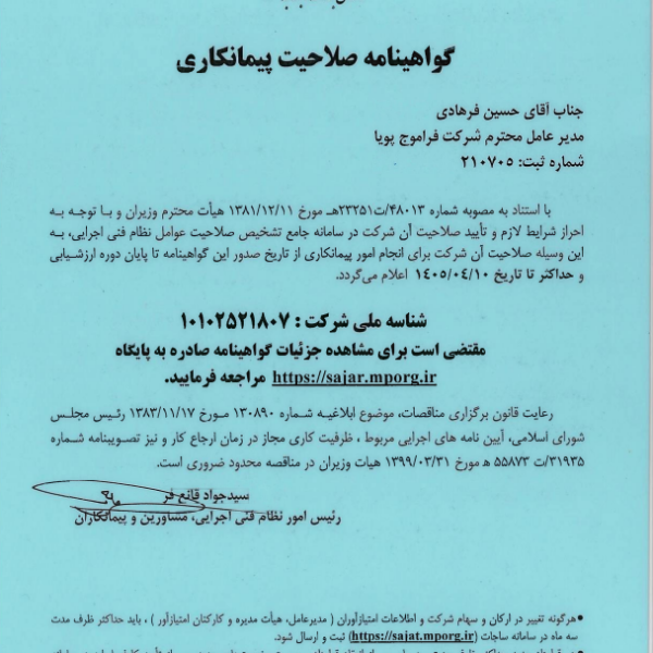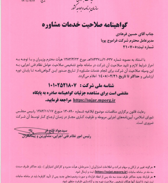 گواهینامهها، پروانهها و عضویتهای شرکت فراموج پویا