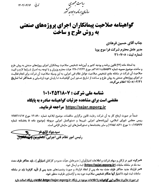 شرکت فرا موج پویا با بیش از 20 سال سابقه فعالیت در صنایع مختلف نفت، گاز و پتروشیمی، نیروگاهی و آب و فاضلاب